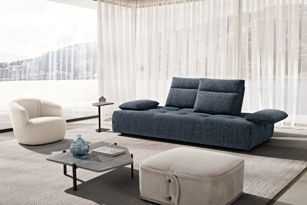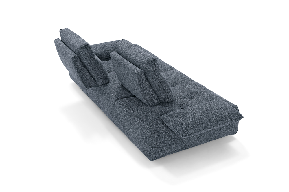 Τα μπράτσα και τα πλαϊνά στηρίγματα μετακινούνται οριζόντια, επιτρέποντας την αλλαγή του βάθους του καθίσματος, με αποτέλεσμα ένας καναπές που εξελίσσεται συνεχώς και ποτέ δεν είναι ίδιος.