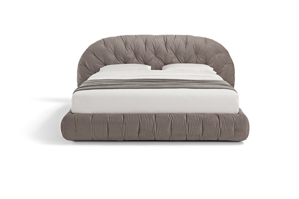 Οι απαλές καμπύλες του προσκέφαλου, με τις εκλεπτυσμένες ραφές, αναδεικνύουν τον χειροποίητο χαρακτήρα του σχεδίου, ενώ το επενδεδυμένο sommier στο ίδιο ύφασμα δημιουργεί μια αίσθηση ενότητας, ισορροπίας και διακριτικής πολυτέλειας.